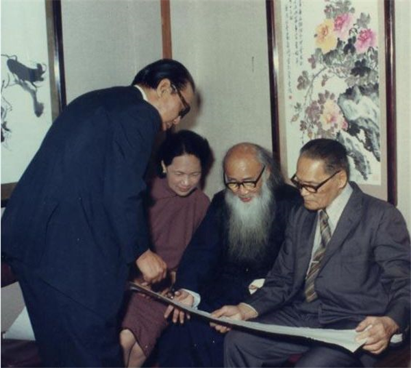 图1.张大千(右二)与挚友黄君璧(右一)、弟子孙云生(站立者)赏画