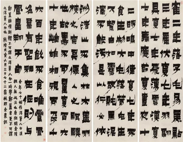 金农的墨色之黑,只有黑炭可比。这些人连墨色都不研究,就把我写的金农当作真的买了去,更不用谈笔法了。要让内行人来看,金农写的“漆书”,学问才大哩!那个笔也不知用的是啥子笔,一落笔就有两个小开叉似的分成三股子走,然后笔力才汇聚在一起,一笔到快停顿时,笔路先按下来一点再稍微往上扬。我对之下了许多功夫,结果还是不满意,一看就晓得,学不到家嘛!金农的字不但笔法是自创的,结构也是自创,所以难学。”