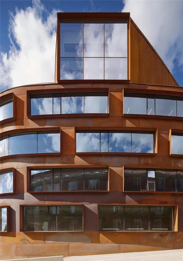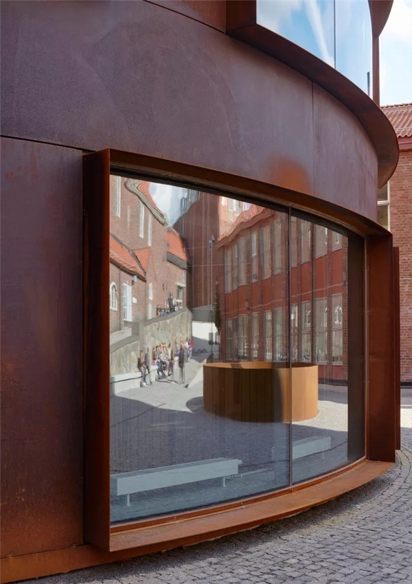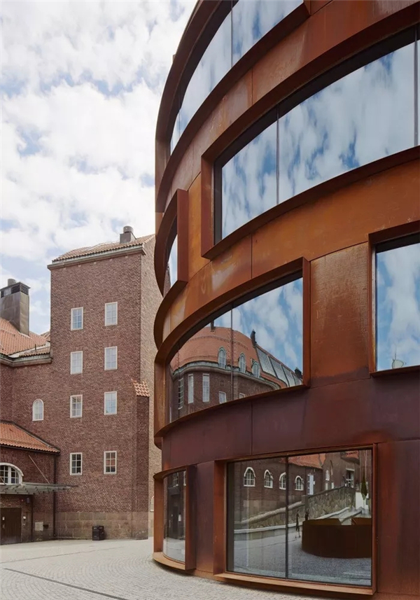 学校建筑外形圆润,共有六层,包括一个下沉式花园和一个屋顶平台,同时以庭院作为空间的外部延申。深红色柯尔滕钢外墙与现有建筑的暗红色砖墙交相呼应。
