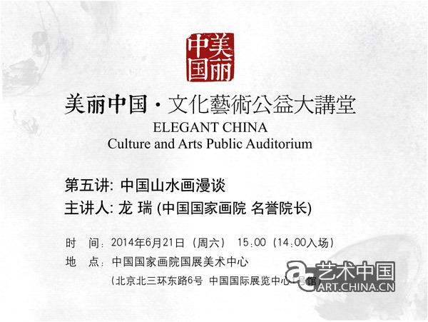 “美丽中国—文化艺术公益大讲堂”将于2014年6月21日举办第五讲,本次大讲堂有幸邀请到中国国家画院名誉院长龙瑞先生主讲“中国山水画漫谈”,向听众讲解其对中国山水画独到的见解。