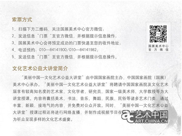 届时,听众在听课之余还可观赏“中国国家画院国展美术中心2014典藏•山水作品展”,该展览展出了以龙瑞为首的16位顶级山水画家(龙瑞、于志学、崔振宽、李宝林、苗重安、江明贤、方骏、卓鹤君、程大利、陈国勇、许钦松、赵卫、林容生、王永亮、刘建、卢禹舜),200余幅当代山水画佳作,不容错过。