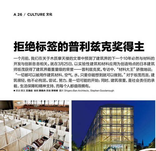 当电话打通,坂茂的声音低沉,语速偏快。他态度鲜明地表示,自己不愿意谈自己的建筑,也很欣慰自己的获奖,只是他并不愿意为自己的建筑风格定性,更直言自己绝不会在盛名之下停滞不前,“这个奖项是很大的荣耀,是对我继续创造美好建筑和继续为受灾地区服务的鼓励,不是结束,而是继续成长。我要做的事情是坚持自己的事业”。虽然,这样短兵相接式的对话贯穿在整个采访过程中,但言语间他对建筑设计的执着,对社会公益的热心,仍然溢于言表。