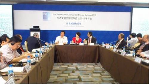 “良好的立法与严格的执法将构筑生态保护的屏障。”“绿色发展,需要我们立即行动起来!”……在生态文明贵阳国际论坛2013年年会开幕式高峰讨论会上,众多国内外政要、专家、学者在结合自身工作经验的基础上,以座谈交流的形式,带来了一场关于建设生态文明,实现绿色变革与转型的头脑风暴。环保部部长周生贤指出“环保不单纯是一个就污染论污染的工作”;全国政协常委、人口资源环境委员会主任贾治邦强调“唤起全民生态意识必须双管齐下”;国土资源部副部长胡存智做了“节约利用国土资源护航生态文明建设”的发言;北京大学校长王恩哥讲述了北京大学“发挥教育科研优势推广生态文明理念”的实践经验;世界自然保护联盟总干事朱莉娅•马顿•勒菲弗呼吁大家“尊重自然”,并指出这样做“必然会获得巨大效益”;清华大学教授胡鞍钢发表“第二代中国改革的关键词是‘绿色改革’”的演说;美国哥伦比亚大学地球政策研究所所长杰弗瑞•萨克斯呼吁大家关注“全世界到了需要改变的时刻”巴西最高法院大法官安东尼奥•本杰明讲述“用法律构筑生态保护的屏障”的重要性;国家林业局局长赵树丛做了“用好‘四条线’保护自然生态”;住建部副部长仇保兴认为“城市发展的重点应放在四个绿色上”;水利部副部长刘宁演讲的主题为“直面水资源困境建设水生态文明”;中国节能环保集团公司董事长王小康提出“环保产业需要政府和公众的支持” ……