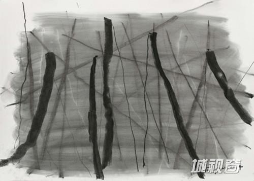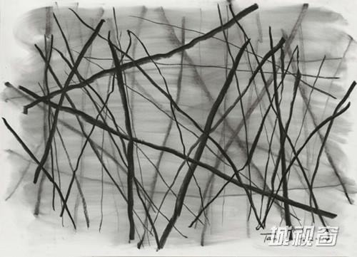 谭平对线的理解不单纯停留在艺术层面,更多的是已过天命之年的人生感悟。偏锋新艺术空间展出的作品中包括一件记录他创作过程的影像。画面不设置背景音乐,镜头跟随炭笔行走的路径,粗细不同的轨迹之后时有炭渣顿下来,可见用笔的深沉与静冥中线条的力量感。倚靠在画廊墙壁观看它,纵使无故事性、无画面感,黑与白之间纵横交错的线条,劳作般画出的每一笔,抽象无形中蕴含了对人生的坦诚、质朴与热情,涂抹掉所有轨迹重新来画更需要勇气。这绝非简单地画一条条线,是人在行走,跳脱出画面元素的局部,它们是人生历程的无数切片,是每一段路的微观缩影,每一笔中注入了岁月的沉淀与严肃的觉知,回归本源,拒绝浮华表象。任何一点都是切片,线条的质感、过程中停落于纸面的富于原始感的炭笔粉末、素色的背景白与层次分明的黑、形象的虚与实、笔触的轻与重,极简塑造出极多,它是全部人生,人生的行走。谭平说,过去画得快的时候感受到的是历程的弯曲,节奏放慢以后没有任何弧度,过程远比结果重要,“不要认为遇到了坎坷,其实都不存在,用心经营并享受每个过程”。