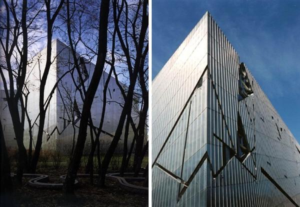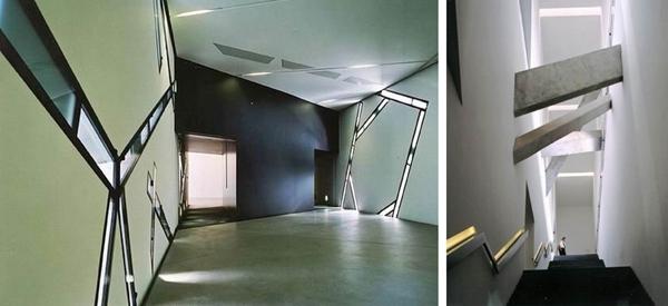 第三个打动我的是由里伯斯金设计的当时还未完工的柏林犹太博物馆。建筑由混凝土建造而成,穿过被称为“空虚时间”的虚空空间,反向的坡道系统令人感觉在不断后退,而不是前进,空虚的塔楼被埋在地下,立面上的小洞成为唯一的光源;两面墙互相联系,但不直接接触,纤细的槽口提供了垂直光束。在建筑中就如同置身于黑暗中。除了从小洞中穿透进来的城市的声音外,建筑内没有任何杂音,营造了强大的沉默的力量。这真是一个绝妙的空间,令人称奇。在项目完成后我又一次参观了该建筑,除了塔楼之外所有的墙都已被灰泥装饰,各种展览也使建筑失去了原有的力量。
