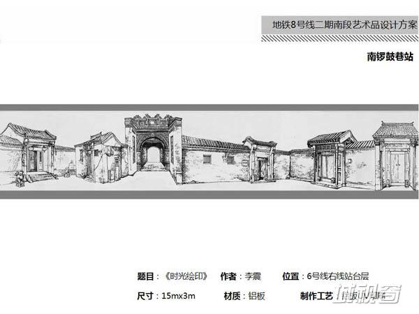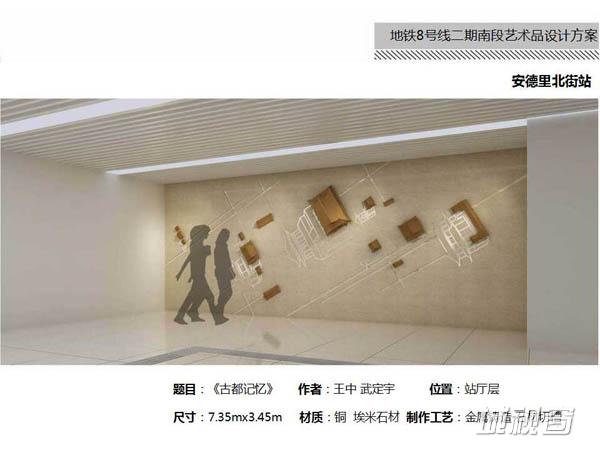 崔冬晖:“在轨道交通的这个空间设计其实现在分两大块,一块是室内设计,天地墙说白了就是尽可能的能够在表达这一站的文化特质和特征的情况之下保证它整体的一个空间效果来做这个设计,这是室内设计这一块。另外一个是公共艺术品,公共艺术品的位置一般是在柱子上或者墙面上,这两个东西以前是分开的,我们最终极的理想当然是希望空间和公共艺术品一体化,这是我们的最终理想。”