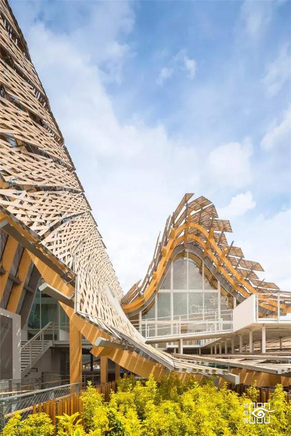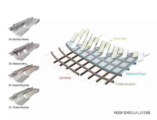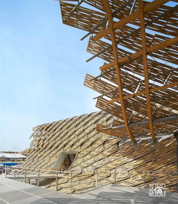“天”——也就是中国馆的屋顶,是一个“三明治系统”, 由下往上依次是胶合木结构系统、PVC 防水系统、竹板支撑系统和最上层的竹竿编织遮阳系统。这个“三明治系统”屋面结构在世界上都是相对前沿的概念,也是整个中国馆建筑技术最复杂,施工难度也最高的一个设计。