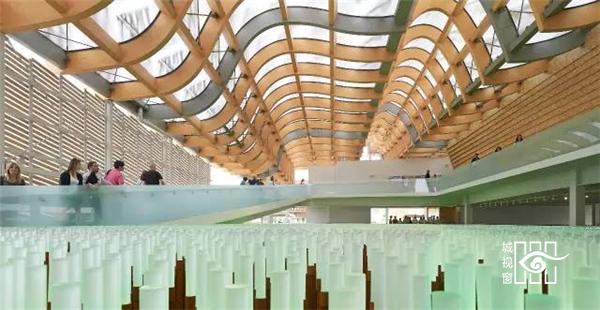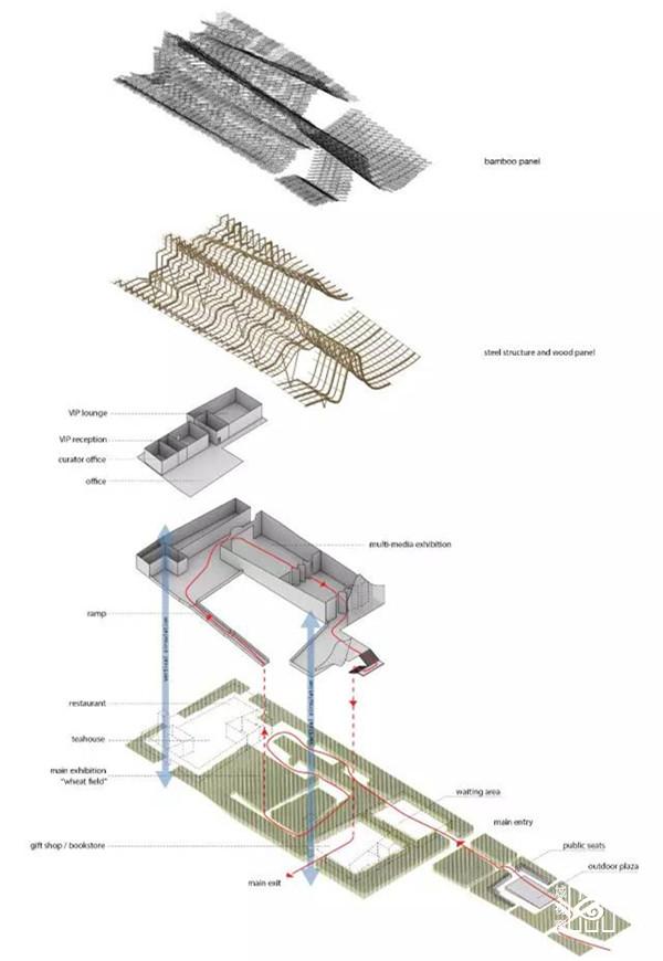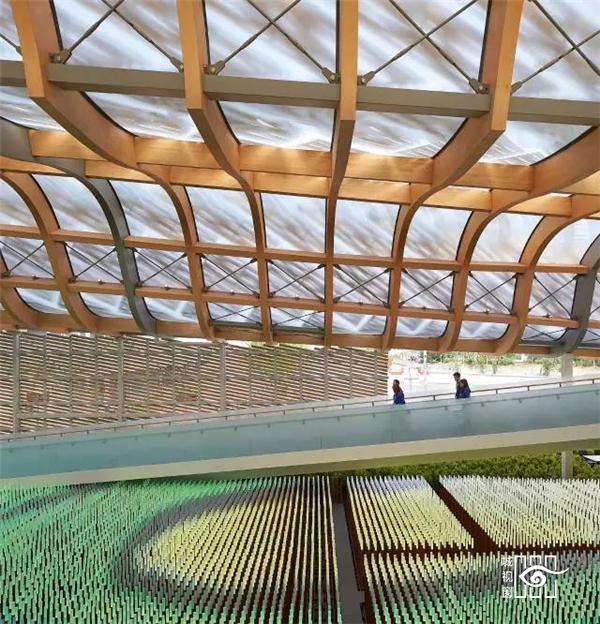 米兰世博会中国馆参观流线设计:参观者通过展馆南侧的小径由下行的坡道进入“麦田”和11个以省市为主题的展陈作品,而后通过上行斜坡道进入展馆的二层,回望由2.2万根 LED“麦秆”铺成的350多平方米的金色麦田。一个个单独的LED灯柱像素构成了一个完整而令人震撼的画面。
