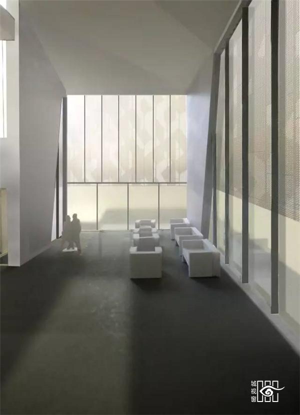 透过这垂直动线的连接,使用者可以选择向北穿越空间中的桥梁通往住宅的景观平台,或持续地进入南侧量体二层的私密中庭。中庭四周为磨砂玻璃,并由安静的植栽装点,将建筑与场地的互动通过景观延伸进室内。游客经由中庭进入休息区,在此可遥望北侧的住宅塔楼。最后作为参观序列的终点,游客走出建筑,步入景观公园。