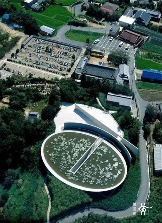 本福寺的水御堂是佛教分支真言宗的一个新的主题,它座落在淡路岛一座小山丘上。水御堂大厅位于地下,其上是一个覆满睡莲的椭圆形大水池。当人们沿着水池中央的楼梯下走,顿时柳暗花明,水御堂大厅就在水面下。大厅内部是一个用木头柱子做网格分割的圆形空间。室内和柱子漆成朱红色,每当夕阳的余辉洒向御堂,列柱就会在室内投下长长的影子,大厅就会充满红光,给人一种神圣的错觉。