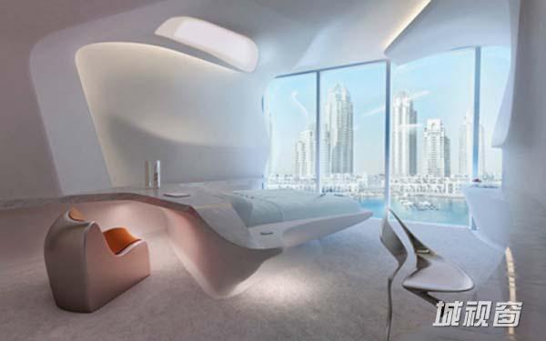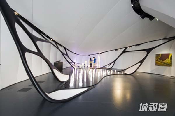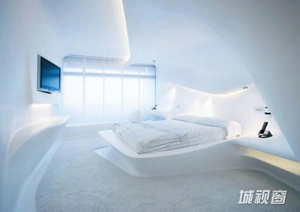流动蜿蜒的曲线,将空间一气呵成。大量使用高度无接缝技术制作而成的LG-hima cs人造石家俱、卫浴设施。客房的大门板内镶嵌LED别出心裁,房客可以在房内控制room service, do not disturb等。扎哈·哈迪德的作品以WindingLines,Fluid Spaces为主题,设计呈现了空间流动性的特色。
