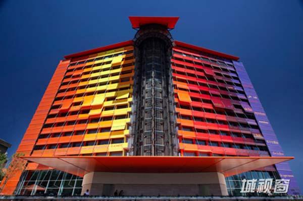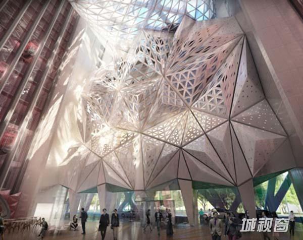 扎哈·哈迪德建筑事务所为澳门设计了一个40层的豪华酒店——新濠天地酒店,建成后将成为澳门首屈一指的休闲娱乐场所。其外观如同一个雕塑元素,暴露的网状结构外骨骼扭曲在一起,内部有一个宏伟的中庭。这种暴露的外骨骼增强了建筑的表现力和力量感,并且有利于优化内部空间。