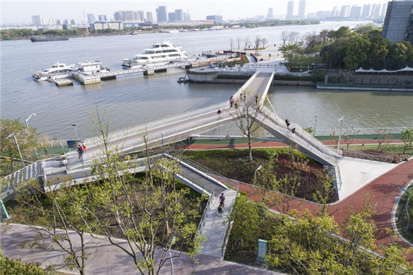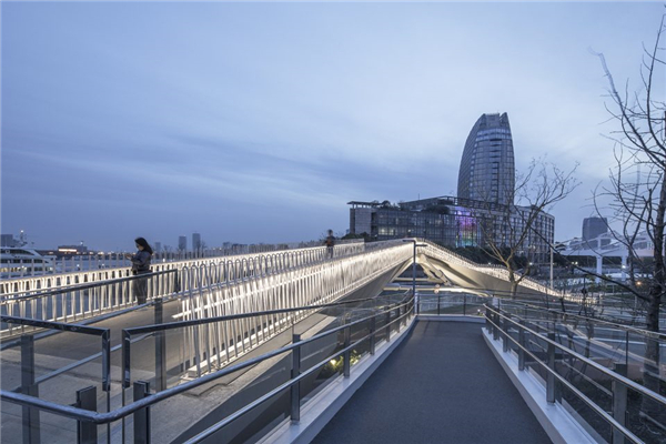 日晖港人行桥跨越约70m宽的黄浦江支流,将徐汇与黄浦区的公共开放空间连接在一起,在功能上接通浦西沿江公共空间的断点,承担人行交通的功能。桥梁两岸分属不同的区管辖,其场所特征也风格迥异,徐汇区一侧延续西岸公共开放空间的宽阔平坦,犹如广场般的公共尺度,而对岸黄浦区南园则是以园林尺度呈现的公园,地形起伏复杂,道路蜿蜒,桥梁的置入需转换两种空间尺度并恰当的连接不同的标高和流线,与此同时桥梁本身亦不能阻挡河流上的船只通行及岸边的人行通道,功能要求颇为复杂。