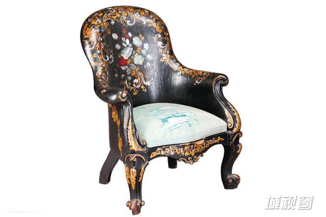 维多利亚时代的洛可可风格椅子,采用安妮公主风格和齐平戴尔风格惯用的弯腿设计。鎏金椅背上镶嵌着珍珠,以髹漆装饰细节。从维多利亚时期开始,家具进入了批量生产时期。