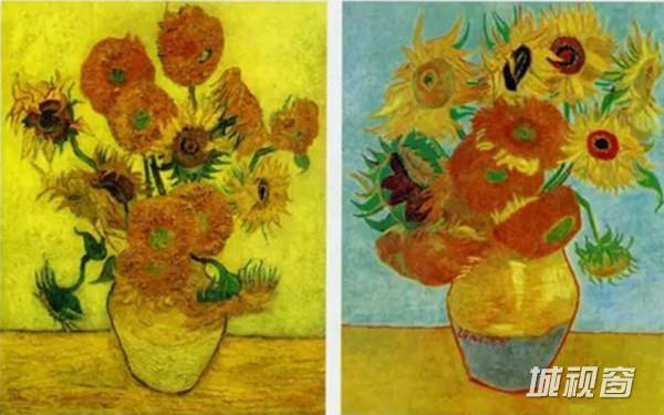 左:《有15朵向日葵的花瓶》 1889年1月 阿尔、右:《有12朵向日葵的花瓶》 1889年1月 阿尔