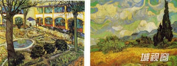 左:《圣保罗疗养院的庭院》 1889年4月 圣雷米、右:《有柏树的麦田》 1889年6月 圣雷米
