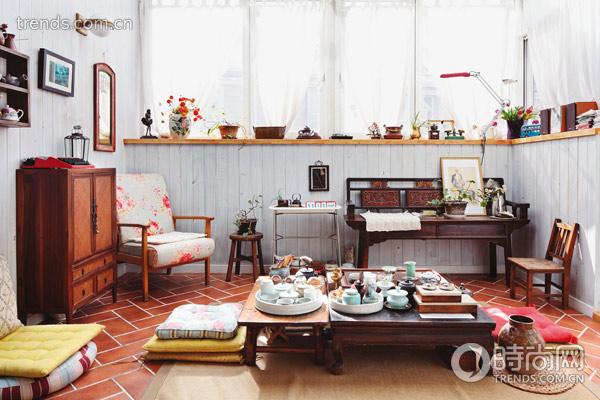 关于一层的阳台,心里还有个孩子的艺菲最初只是为了给一张喜爱已久的“day bed”找个安放的地方,发现只有阳台最合适,于是封上玻璃,铺上怀旧味道的红色地砖,玩起色彩的游戏,调和出近于晨雾的蓝色涂刷墙面,将拖地的轻盈窗帘松松地绾上一个结,懒懒地堆在窗台上。当一切改造完工后,她发现,在这里,更适合被一堆可以细品的美丽小物包围着,晒着太阳,喝着茶。