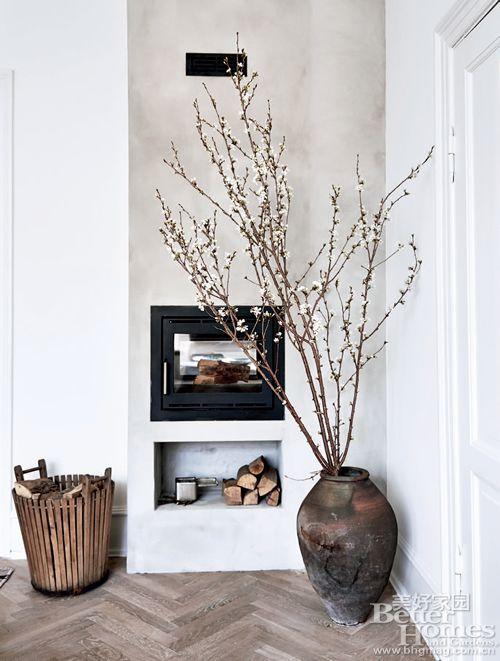 "门廊入口处摆放了一个插着腊梅的圆肚水 缸,给这幢散发着清新气息的别墅平添了几 分古典的韵味。存放柴火的木桶也随意地 摆在门口,兼具实用性与装饰性。"