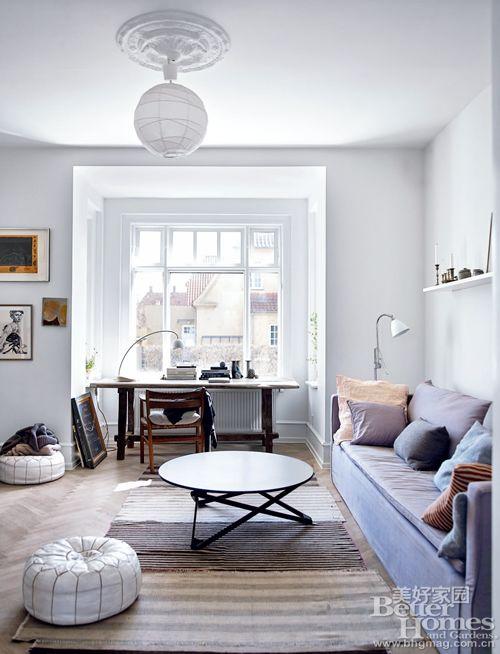 "Maria 家的起居室设计简洁清爽, 具有浓郁的北欧风情。 AIAYU 的手工靠垫 随意地摆放在沙发上, 中和了硬朗的结构线条。"