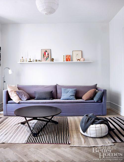 "起居室里的靠垫和地毯 都是来自AIAYU 的作品, 让自己随时被喜爱的东西 环绕是Maria 的愿望, 家中的陈设也处处显露出 她对简洁风格的喜爱。"