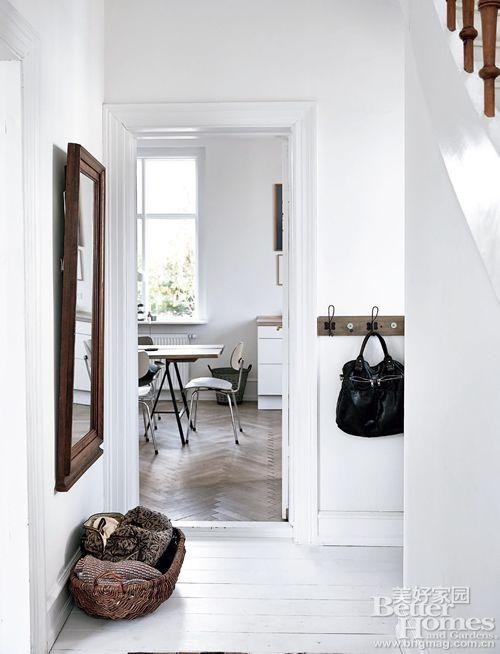 "Maria 家的餐厅正对着门廊入口处, 人字形拼接的地板 和走廊里的纯白色地板 形成了清爽的色彩对比, 也提升了空间的层次感。"