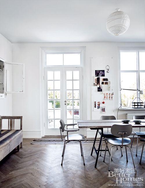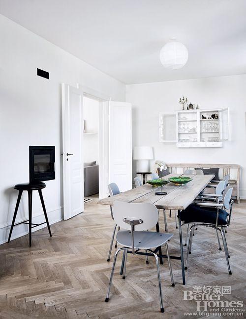 "Maria 家的餐厅布局略显空旷, 这是为了给孩子们留下 用餐之余的活动空间。 白色搭配原木色的主色调 更增添了整间餐厅的空间延展性。"