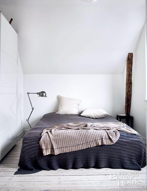 "阁楼上的卧室依旧奉行一贯的简约风格, 所有床上用品均出自AIAYU, 纯手工的羊毛质地给人带来舒适的感受。"