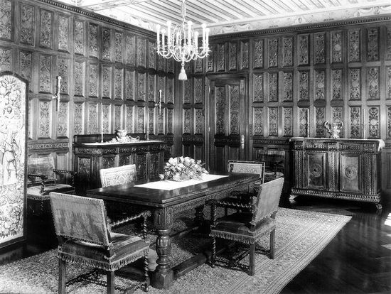 餐厅。这里据称是仿照克拉家纽约第五大街老宅的样式。167道垂直的竖板是由一整块黑橡木而来。天花板上刻画着一些怪兽和经典的童画人物。