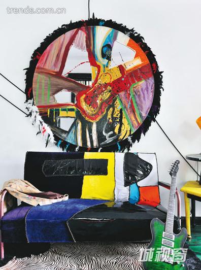 在Redic 的家里,有许多色彩斑斓的艺术品,它们与同样多彩的家具一起,形成了浓郁的艺术氛围。客厅的沙发都是淘来的旧货,经过各种材质饰面的拼贴,摩登的色彩和几何造型,让它重新焕发出时尚的光彩。而卧室里漂亮、别致的绿色大衣柜和白色置物柜,竟是二次创作后的宜家衣柜和老式碗柜。