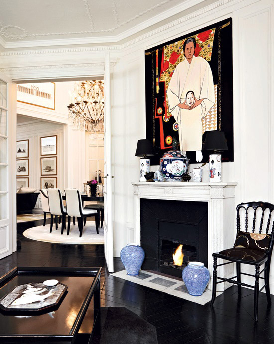 “一直以来我就想住在这样的家里,”Kenzo解释,“这里主要的构思灵感源于日本设计传统中对空间感的需求,至于同时并存的另一种奥斯曼风格,我最初认为它们可能会格格不入。但细想一下,它确实是我想要的那种能将巴黎气质呈现出来的最佳选择,于是我还是将二者混搭在一起,窗外以巴黎铁塔为主的标志性街景可以因此而延伸进来。”为了配合这种风格,Kenzo还专门添置了一些闪亮华丽的家具。同时,为了增大空间感,几面墙被拆掉,原本古朴的楼梯也被改造得更现代雅致了。寓所中还放置了许多主人 从古董店淘来的中式和日式摆件,墙上挂着非洲部落风格的画作,但整体装饰风格却以欧式为主导,让人置身于新旧、东西文化的融合之中,安稳、平和但不沉闷,Kenzo式的时尚风格在这个家中的延续不言而喻。