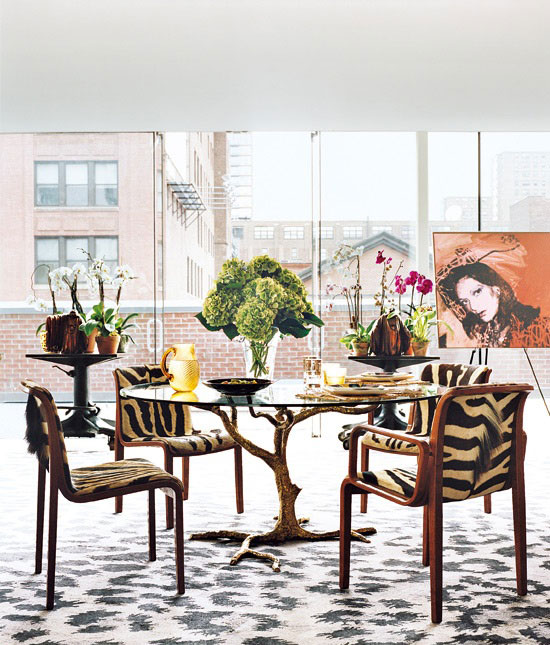 “Diane希望在她的商店之上能有一处‘世外桃源’,”她的现任丈夫、媒体大亨巴里·迪勒(Barry Diller)说,“那儿并不是我的风格,有点儿中庸,但到处都很舒适。”Diane为这个家选择的内部装饰活跃得令人惊叹:书籍和照片充斥着每个角落, 墙上还写着鼓舞人心的字眼——“智慧、改变、喜悦”。巨大的 Ruhlmann桌子占据了办公兼起居的区域;豹纹地毯上则是斑马纹皮椅;名为“达利之唇”的沙发后挂着艺术家Anh Duong的自画像。虽然这些都是让人艳羡的艺术品,但是她却没有刻意收藏。实际上她也不赞同刻意收藏——“人们会成为收藏品的奴隶”,这话恐怕也只有拥有过的人才有底气说吧?