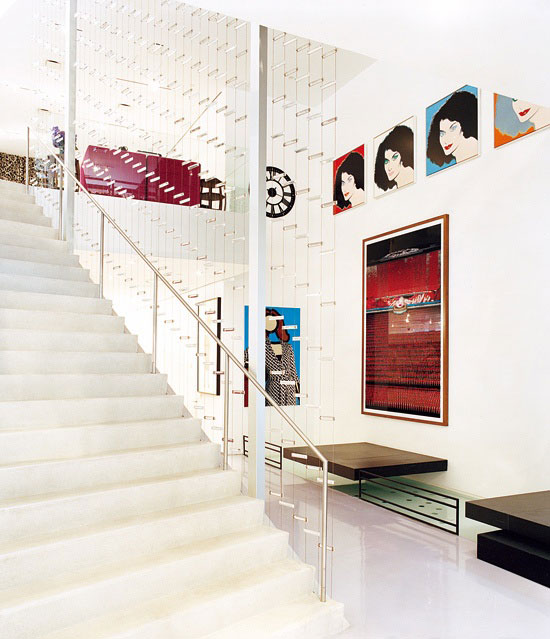 他们首先用楼梯把两座楼连接起来,楼梯一直从一层延伸至顶层的生活空间,天台上则是一间83m2的主卧室。“我们希望能有一抹 像对角线般切开大楼的光线,” Amale说,“这需要从楼顶着手。还好Diane设计的多面体珠宝给了我们灵感。”精心设置的反射装置将光线顺着24米的楼梯引到地面,楼梯边缘还挂了 约三千枚施华洛世奇水晶作为装饰。