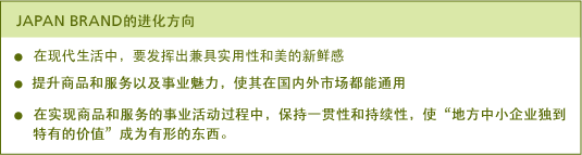 JAPAN品牌扶植支援事业的宗旨是:通过使“地方中小企业独到特有的价值”不断“进化”,致力于现代生活以及国内外市场都能通用的商品和服务 → 地方品牌的确立 →?自身经营基础的加强 →?为搞活地方经济做贡献。而且,JAPAN品牌扶植支援事业所致力于这种方向可以用“新的传统创造”一句话来表述。