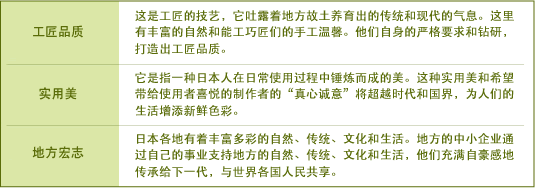 日本各地不仅有哺育发展起来的手工制作的传统、技术和技能,还有为独特的审美意识和智慧所印证了的营生生活。而且,参加日本品牌扶植支援事业的地方中小企业,对于手工制作和地方故土都满怀着热爱、自豪和责任感。 JAPAN BRAND 把它们视为地方中小企业能够跨越时代和国界大展身手的“优势”和“宏志”,我们把“地方中小企业独到特有的价值”归纳为以下三点。