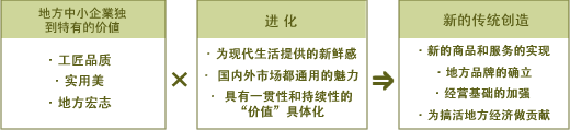 JAPAN BRAND的品牌概念(JAPAN品牌扶植支援事业所致力的方向=运动的理念)是“进化地方中小企业独到特有的价值,创造新的传统”,可以用下述图表来表示。