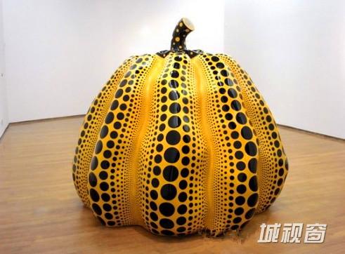 草间弥生还把她的圆点运用在雕塑艺术中,在她最具代表性的圆点南瓜系列作品(如图3)中,排列有序的黑色圆点妆点在南瓜棱突起的轮廓上,每个南瓜棱的中间部分是由一条大点串成的,大点两边渐变排列着逐渐缩小的串串小点,给观者带来独特的视觉体验。又如草间弥生2009年创作的《维纳斯——被无限网所抹杀的维纳斯雕像》,她在背景画布上描绘幻想中的圆点图案,然后把它延展至立体雕塑维纳斯女神上,她将现成品维纳斯雕塑布满与其背景颜色相同、圆点大小一致的网纹图案,使得维纳斯雕塑被同化在其背景之中,并十分自然地与背景网纹紧密地融为一体。我们可以看到,重复排列的圆点是草间弥生前卫艺术的代表性符号,在以现成品维纳斯为主的《无限网》雕塑系列中,其《维纳斯——被无限网所抹杀的维纳斯雕像》(如图4)在2011年(82岁)香港拍卖会上刷新了草间弥生世界拍卖雕塑作品的新记录,说明了世人对其艺术作品价值的高度认可。