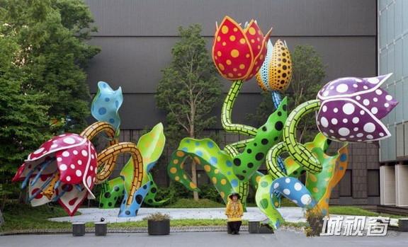 色彩是造型艺术的基本要素之一,而且更是一切视觉元素中最活跃、最具冲击力的因素。草间弥生的作品总是以绚丽缤纷且对比鲜明的色彩来吸引观者的眼球。如1954年的绘画作品《花(D.S.P.S)》(如图5),这幅画主要由红、黄、蓝、黑四种颜色所构成,草间用大面积的黄绘制瓶身,少许红花点缀在其中,在由植物枝叶形状拼接的蓝墨色背景上更显得十分抢眼,使它们在红、黄、蓝三原色对比作用下又形成了鲜明的色彩同时对比。2002年,草间弥生在日本长野县松本市美术馆展出的作品《梦幻的花》(如图6),其中的花卉给人张牙舞爪的感受,并施以高纯度的艳丽色彩,用其一贯的圆点母题进行大小、疏密的排列妆点,使整个用加固玻璃纤维以及混凝土建成的巨型花束显得更加妖娆美丽。