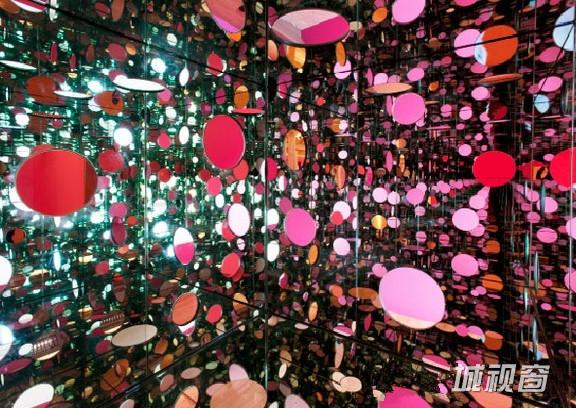 草间1966年的作品《无限的爱》(如图8),是她最具有代表性的装置艺术作品,也是她在纽约的成名作。整个装置使用大量圆形灯泡和大面镜子,带有闪烁的灯泡光点被镜面无限反射延伸后,最后投到观者眼中的景象,形成了目炫而又神迷的感官效果,挑战人们的视觉体验。在后来很长的一段时间里,草间一直保持着类似的创作风格。如在2005年草间弥生创作的作品《消逝的冬季》(如图9),整个装置艺术作品布置在盒装的空间里,四周布满了大面镜,方盒中悬挂着高低不一的彩色圆形镜子,这些镜子经过镜面反射实现了圆点数量上的积数叠加,让这些通过镜面反射的圆点在整个装置空间中又达到一种无线延伸的状态,其投射的影像给人支离破碎的感觉,使人仿佛进入到了一个视觉和幻觉交融的盗梦空间。
