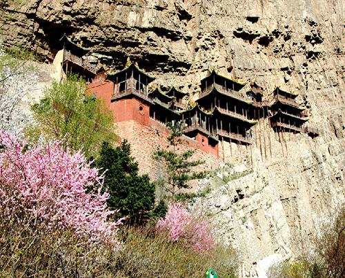 从谷底向上看,距地面高58米的悬空寺悬若长虹,山门、钟楼二楼,大殿,配殿,杂殿等寺庙建筑应有尽有,小巧玲珑,既有江南寺庙的精致,又有北方山地庙宇的气概。