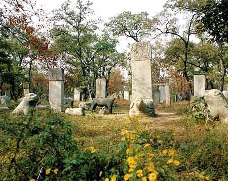 孔子墓前东侧有三亭,是宋真宗、清圣祖和清高宗来此祭孔时停留之处,叫作“驻跸亭”。孔林中除孔子墓外,气派较大、墓饰规格也高的,要数第七十二代孙孔宪培妻子的墓——于氏坊。墓前高大的木制牌坊上书“容音褒德”。这位于氏夫人原来是乾隆皇帝的女儿,因当时满汉不通婚,皇帝便将女儿过继给一品大臣于敏中,又以于女名义下嫁给衍圣公,故称于氏坊。孔林里还有一位名人之墓,那就是清代戏剧家孔尚任,他因著《桃花扇》一书而名盛—时。他的墓穴位于内圈外侧的东北角。墓碑上刻有:“奉直大夫广东清吏司员外郎东塘先生之墓。”孔尚任曾为康熙皇帝导游孔庙和孔林,由于他学识渊博,讲解生动而深得皇帝的赏识。