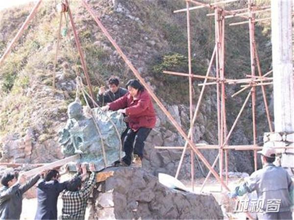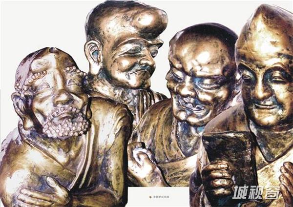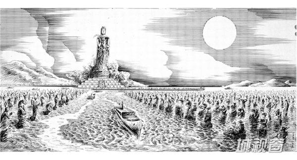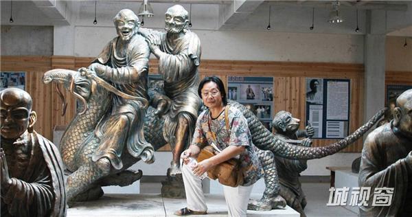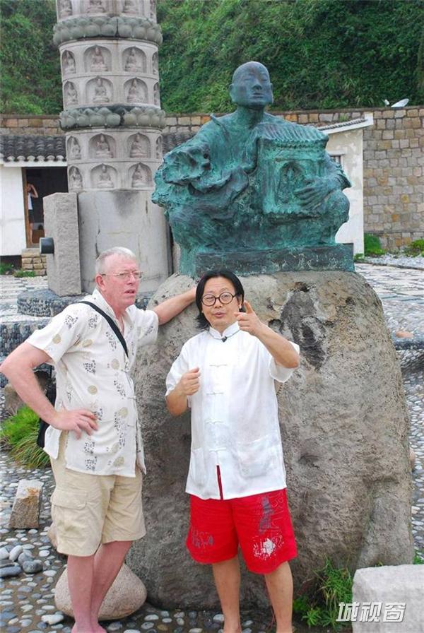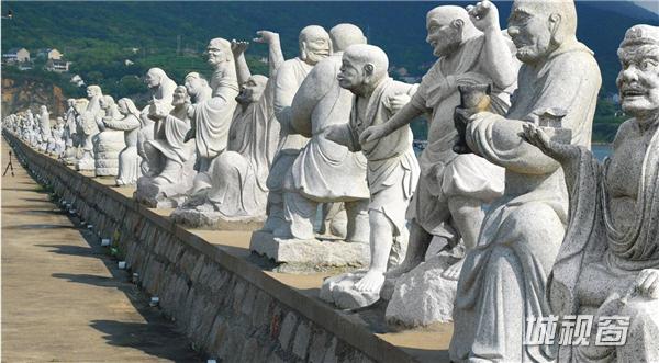 这是我打桩打下去12米的这是,这个和尚是日本和尚1200年前第一个发现普陀山的,五台山捧了个观音回去,观音不肯走,半夜船抛在我的岛边上,我们普陀山一年有多少亿的收入,全靠他,因为原船的样子我到上海造船厂、广东造船厂都问了,造不到原船的样子,1200年,我就抽象的思维,这个桅杆这是一个96种观音让它到日本去,朝着日本的方向。这个是我自己岛上的艺术馆,这个罗汉全部比真人大,都比人还高,这全我自己干的,这个时候在干的,人都快死了,跟着我的两个博士生、研究生都全部晕倒了,我不倒的,我在岛上带着农民工很能吃苦的。