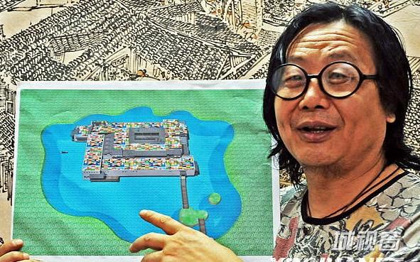 1996年我没办法了,我只能把这个岛买下,这个岛你看后面淡淡的是普陀山,观音躺在这个水面上.我说你们不要把它炸掉,做房地产什么,你这个留着给子孙们看看也好的,去弄掉它干什么,它存在就有它的道理,没办法一定要炸…我只能把它买下,96年,92年让搞的,96年买下。买下后我开始一个人建,原来的样子嘛,后来我画了一个,造168米高的那个大观音,我画好去造出来,画好就能造出来,我这个方案一做好施工部直接做掉了,这些都是我造好的。这些建筑你看它是艺术,这些建筑它的芦苇、青铜、雕塑、建筑、这种墙体都是非常的生态、非常的艺术、非常的美好,这就是用艺术修复了生态,但是它功能性很强。