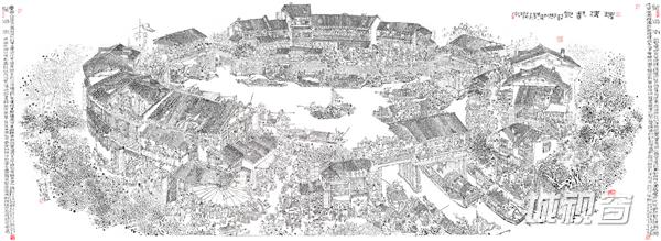 这幅画画了十年,把整个运河拱墅区20里路的银湖墅在康乾年间的所有景象,米市、菜市、鱼市,我全部把它画出来,清明上河图才200多人,我这画上有两万多人,画5分钟这个领导来了,画5分钟这个员工跳槽了,画5分钟说这个人吵起来的,画5分钟说工商局来了,我们企业吓得刮刮抖的,但我照样看不出画中有毛笔和宣纸上的零点一秒的迟疑,出来天衣无缝。三条河对冲,风水很差的,做什么倒闭什么的,他们不相信的,旁边的信义坊、小河直街、富义仓做什么亏什么,多少亿下去都亏了。我说只能把这三条河相冲点打个圆把它锁定,它是一个京杭大运河南端的一个句号,是杭州大运河的一个地标。我在设计书的封面上写了“南有河坊街,北有胜利河”,大家都笑我,河坊街是南宋御街,跟上海南京路一样的,杭州最繁华的街,你这个垃圾河怎么赶得上它?谁也没想到等我一造好,生态改造了、旅游带动了、GDP上来了、就业率上升了,成为中国十大餐饮街之一,超过河坊街了。吃饭要挂号排队的,你们看,当一个有思想、有文化、有干劲的设计师用他的心去做一个事情的时候,他所迸发出来的力量和主观能动性真的能改造这个世界。