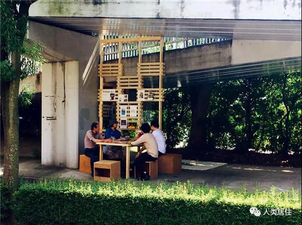 其中,以“树荫下的图书馆”为主题的小组,在调研的过程中发现了步行桥下一个空荡荡的空间。这块空间一侧是道路,另一侧是图书馆,被茂密的树木环绕,就像是童年时梦寐以求的秘密基地。学生们希望活用起这个空间,使得当地的大人和小孩在从图书馆回家的路上,能在这里悄悄地驻足休憩,悄悄地看会儿书。所以,学生们就用木材在这里搭建起了一些简易的隔板、书架和桌椅。这个不起眼的空间最开始并没有引起太多注意,但随着场所慢慢地被越来越多的人知道,渐渐成为了当地聚集人气的新空间。