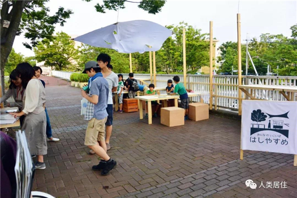 社区微更新被纳入大学的一门课程,学生们为丰富街区空间提出方案,并将其设置在场地中进行实验。其中一个小组,在公园里设置了用纺织物围合而成可进入玩耍的休憩空间。一个小组制作了可移动设置的露天迷宫,受到孩子们的喜爱。一个小组在宽敞的步行专用桥上摆放起桌椅和移动摊位。还有一个小组用各种装饰方法来设计打造八角堂。