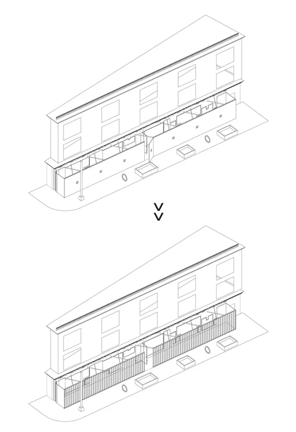 而此次设计的临时“店面”是一个阶段性变化的装置,它看上去有意隔绝内外,实则不然。与城市中惯用做法一样,原始店面被施工围栏完全遮盖住。