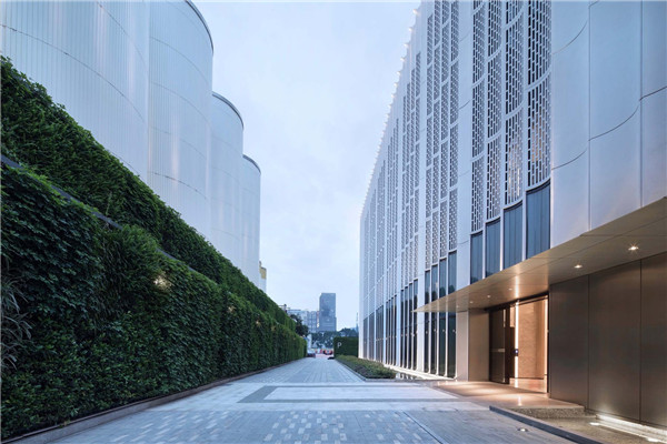 整个项目以UHPC板和高反射镀膜玻璃作为主材料,在首层部分,得益于高反射镀膜弧形玻璃上扭曲形变的罐体反射图像,人们游走于建筑与罐体之间时的体验呈现出前所未有的戏剧性和极强的场所参与感。