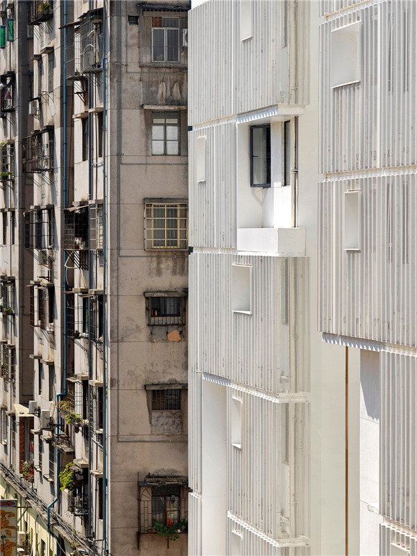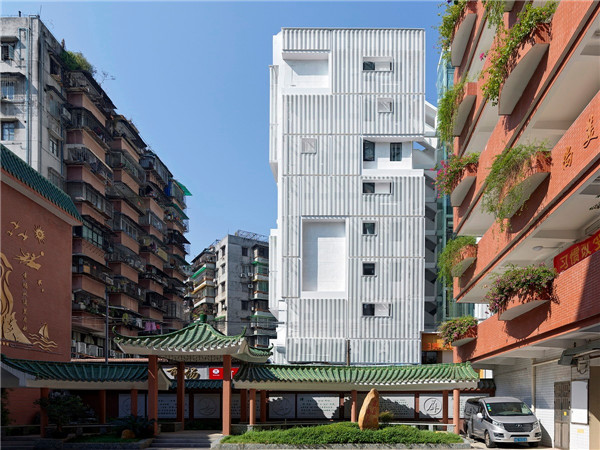 而背后与城中村内原有建筑的“对话”也突出了新与旧语言的对比,与周边大小建筑共生的状态强调了城市立面肌理层次的“拼贴”感。