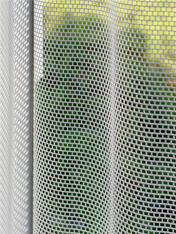 我们对立面上铝板冲孔的方式和比例关系进行了研究和沟通,经过反复打样确认后,选择了波浪型的冲孔铝板,从中庭两端包裹延伸至外部的立面。冲孔的样式力求与原建筑立面的拼接马赛克相呼应,通过半透样式的覆盖层和灯光设置为整座建筑“减重”,以轻盈的“节奏”和跳跃性的体块分割迎接房间外的车水马龙。