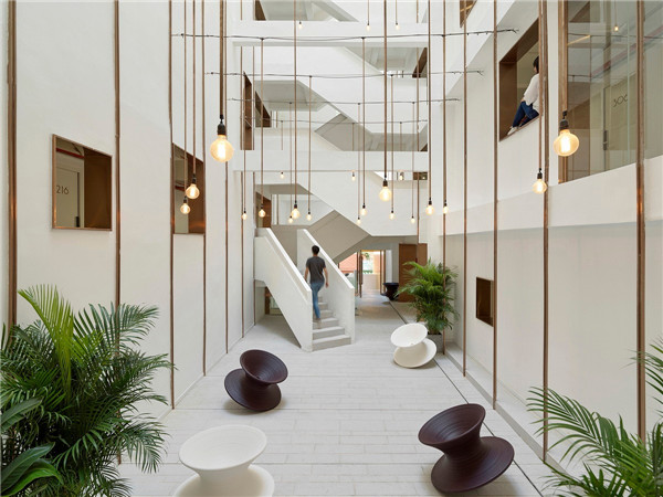 本次设计首先从中庭入手,清理院内的原有搭建,并整理空调和各类线管,以保证庭院的开敞度和舒适性。因地制宜,充分利用原建筑主要立体动线围合成的公共空间,通过视觉上内立面的趣味性营造,保证新住户在中庭及错层通廊的驻留度。